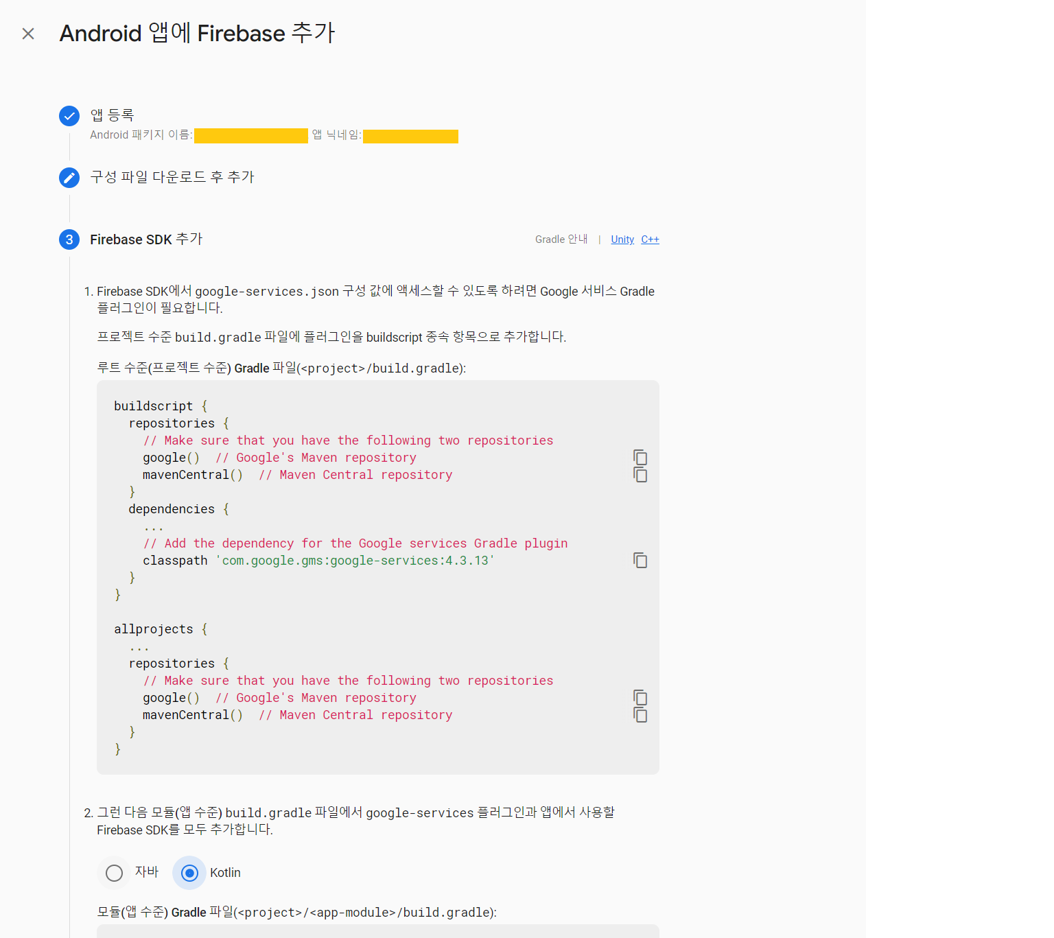 Android앱에 Firebase를 추가하게되면 다음과 같은 웹페이지를 확인할 수 있습니다.