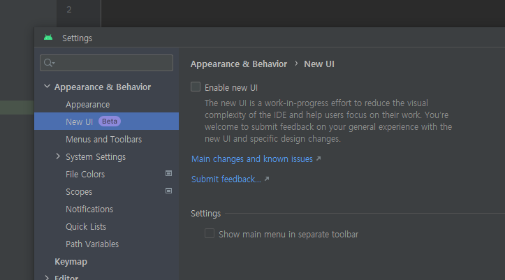 File -> Settings -> Appearance & Behavior 메뉴에 들어가시면 New UI (Beta)라는 항목이 생겼는데요.